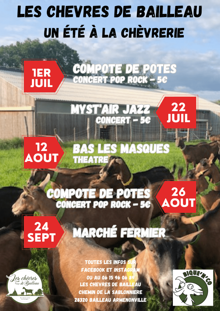 - 30 aout : concert à la chèvrerie avec le groupe LKO à partir de 19h, buvette et restauration sur place